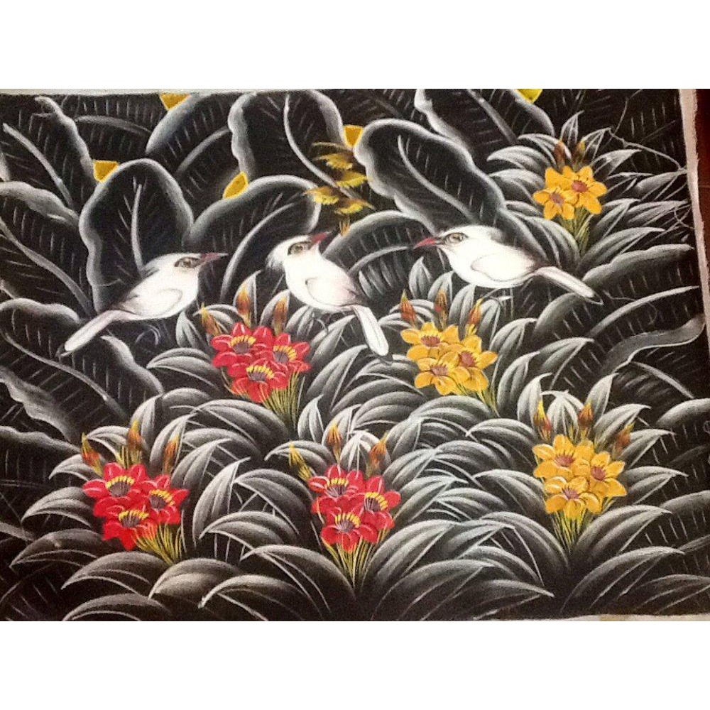 Lukisan Burung Jalak Putih Background Hitam Dan Bunga Merah Parts