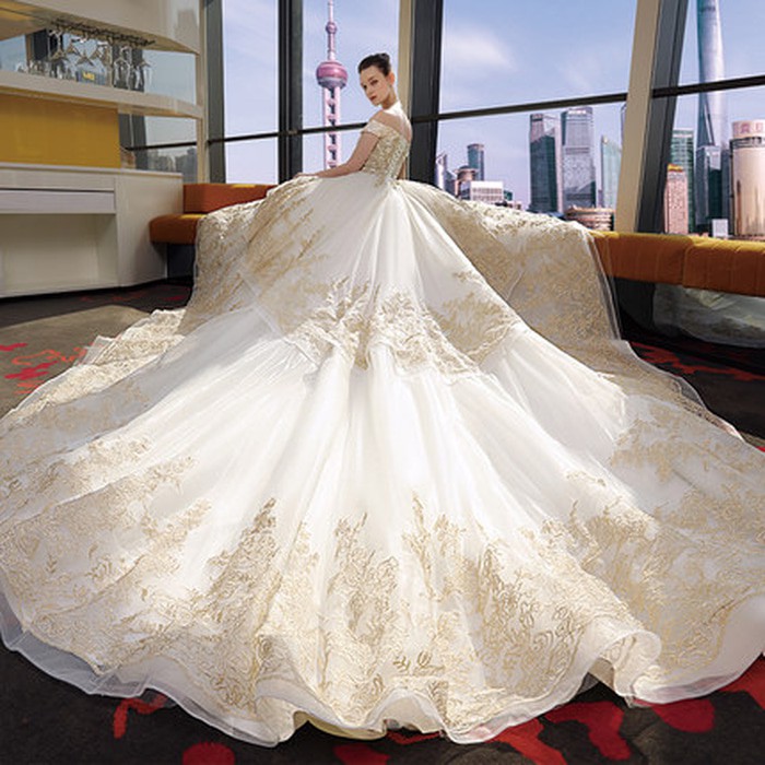 Gaun Pengantin 0030318 Putih Emas Gold Sabrina Ekor Wedding Gown