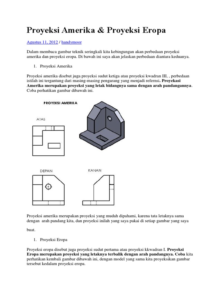 Hal tersebut perlu dilakukan agar terdapat kesamaan atau satu kesepahaman antara perancang gambar designer juru gambar drafter serta pengguna gambar operator sehingga informasi yang terdapat pada gambar dapat dipahami baik oleh designer drafter maupun operator. Gambar proyeksi amerika dan eropa merupakan teknik yang sangat umum digunakan dalam gambar teknik. Proyeksi juga berfungsi untuk menyatakan wujud benda dalam bentuk gambar yang. Proyeksi amerika proyeksi amerika disebut juga proyeksi sudut ketiga atau proyeksi kwadran iii perbedaan istilah ini tergantung dari masing masing pengarang yang menjadi refernsi.