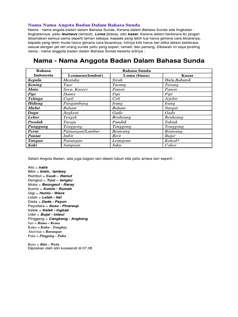 Nama Nama Anggota Badan Dalam Bahasa Sunda Kasar Halus Dan Artinya