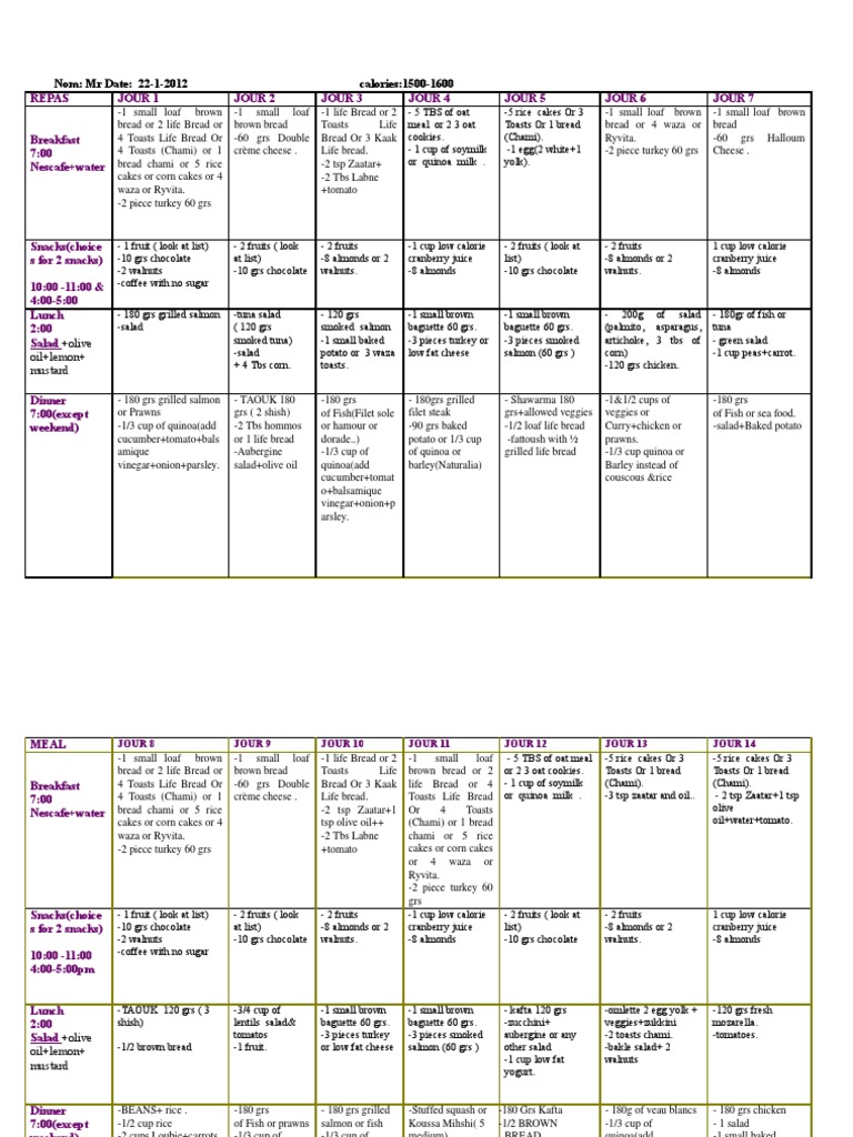 Nom Mr Date 22 1 2012 Calories 1500 1600 Repas Jour 1 Jour 2